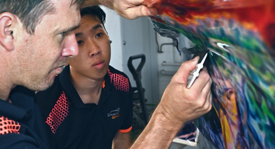 Our workshop is capable of wrapping any boat in length of 5.5m or smaller in our workshop, any larger vessels, our team pack up our mobile shop and we come to where your vessel is moored or perhaps getting a refit. We’re fully capable of working with any size vessel.